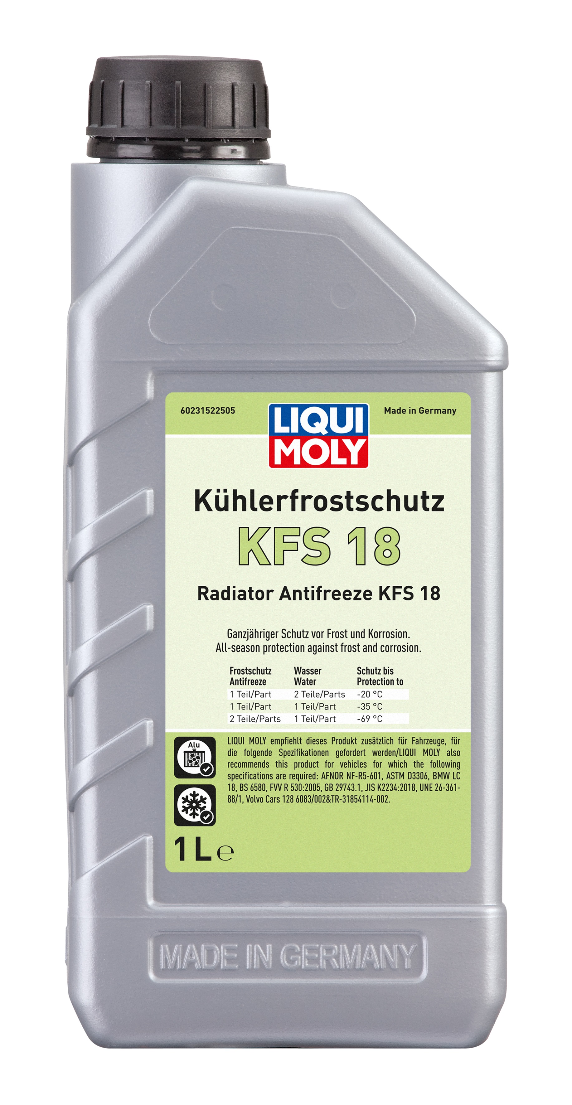 Soyutma sistemini LIQUI MOLY Radiator Təmizləyicisi (hissə № 3320) ilə təmizləyin sonra boşaltın . Qarışdırma cədvəlinə və istehsalçının göstərişlərinə uyğun olaraq Radiator Antifriz KFS 18 və su ilə doldurun. Bunun üçün distillə edilmiş suyu tövsiyə edirik. Yerli qaydalara uyğun olaraq utilizasiya edin. İstehsalçının göstərişlərinə uyğun olaraq intervalı dəyişdirin.